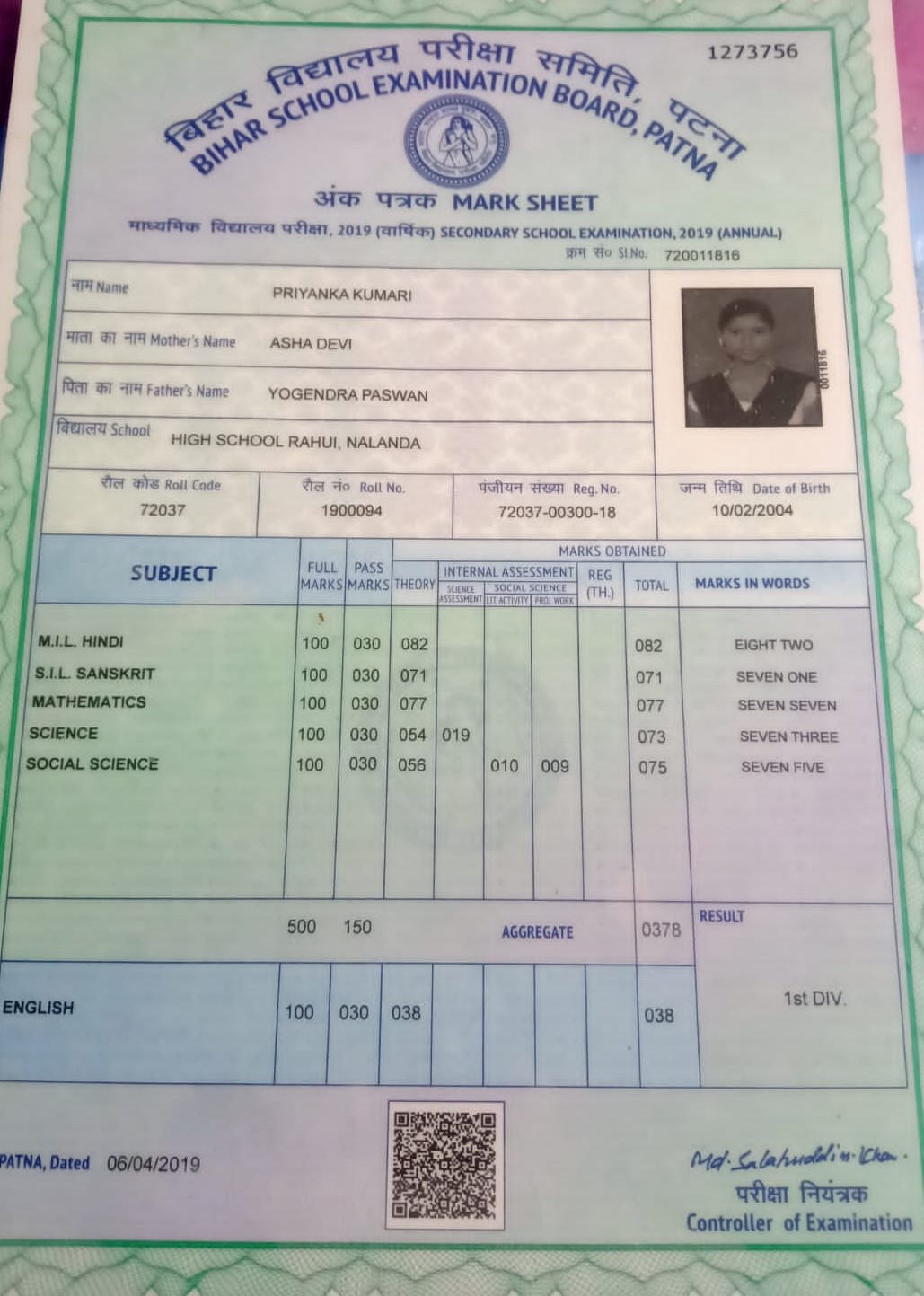| Exam | Full Marks | Pass Marks | Marks Obtained |