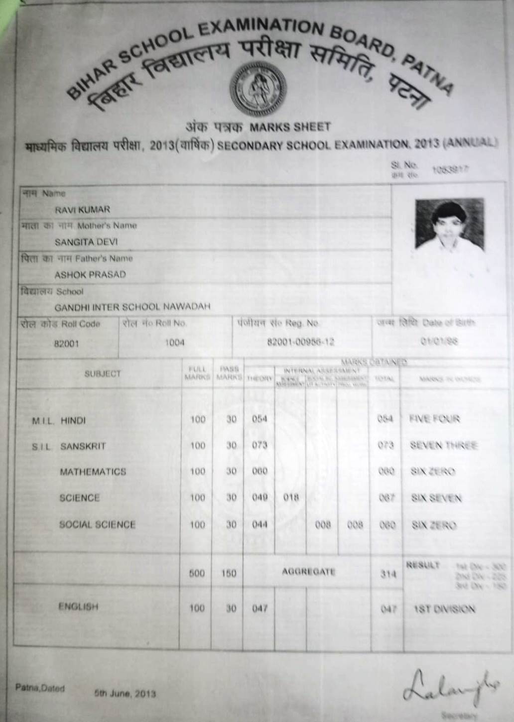 | Exam | Full Marks | Pass Marks | Marks Obtained |