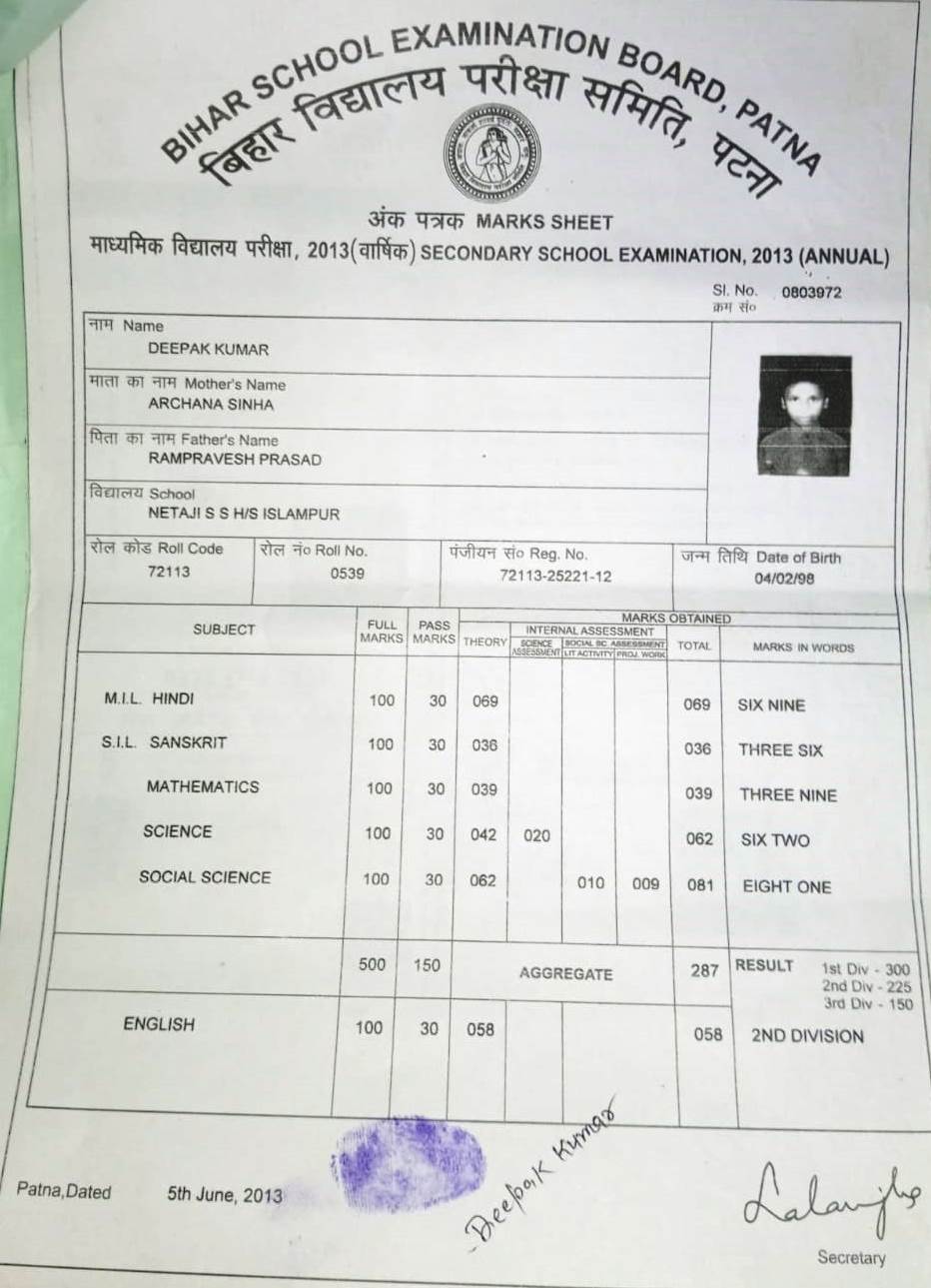 | Exam | Full Marks | Pass Marks | Marks Obtained |