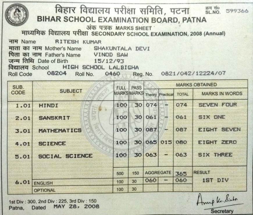 | Exam | Full Marks | Pass Marks | Marks Obtained |