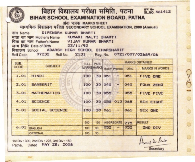 | Exam | Full Marks | Pass Marks | Marks Obtained |