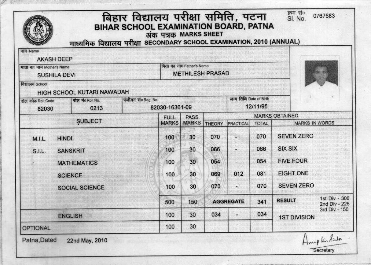 | Exam | Full Marks | Pass Marks | Marks Obtained |