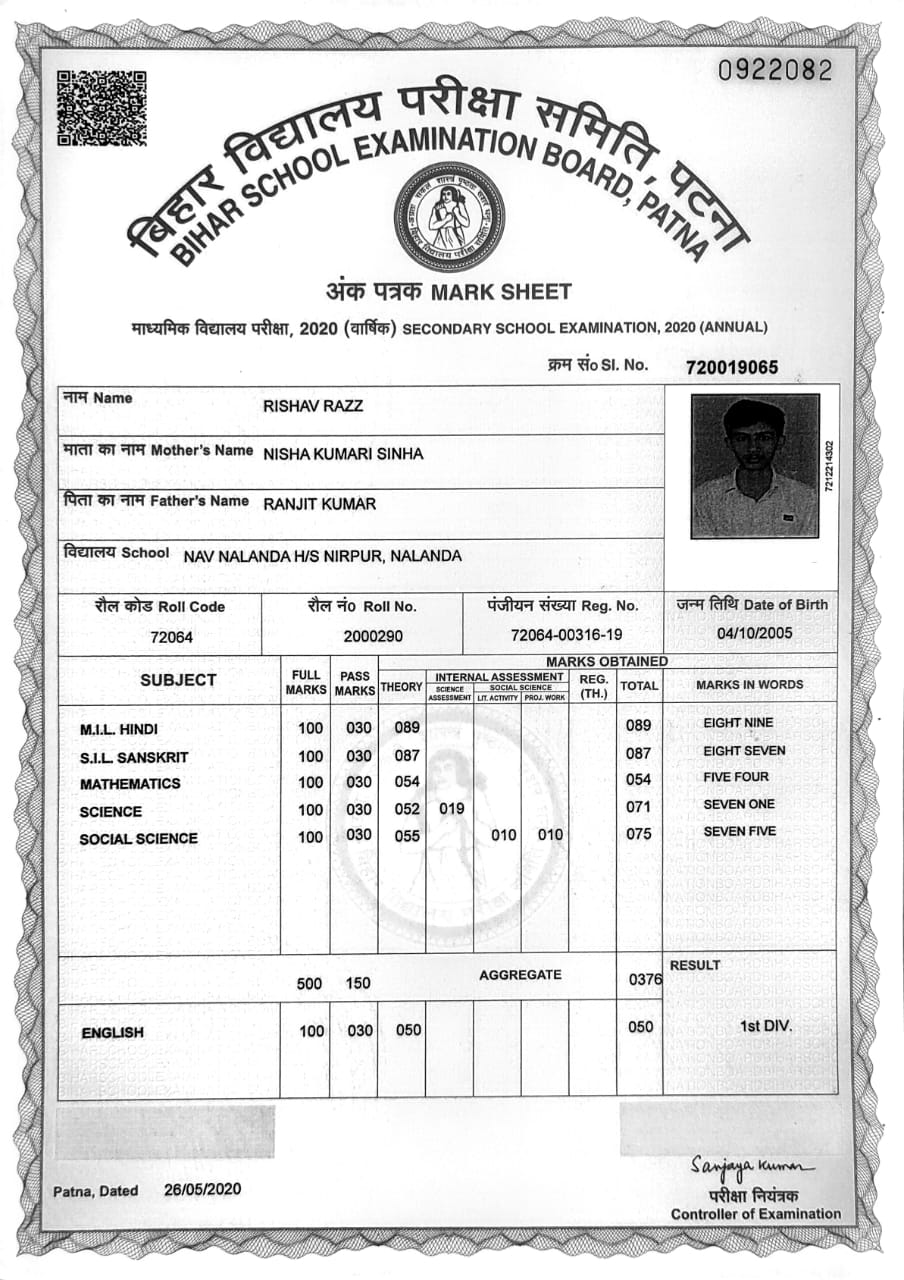 | Exam | Full Marks | Pass Marks | Marks Obtained |