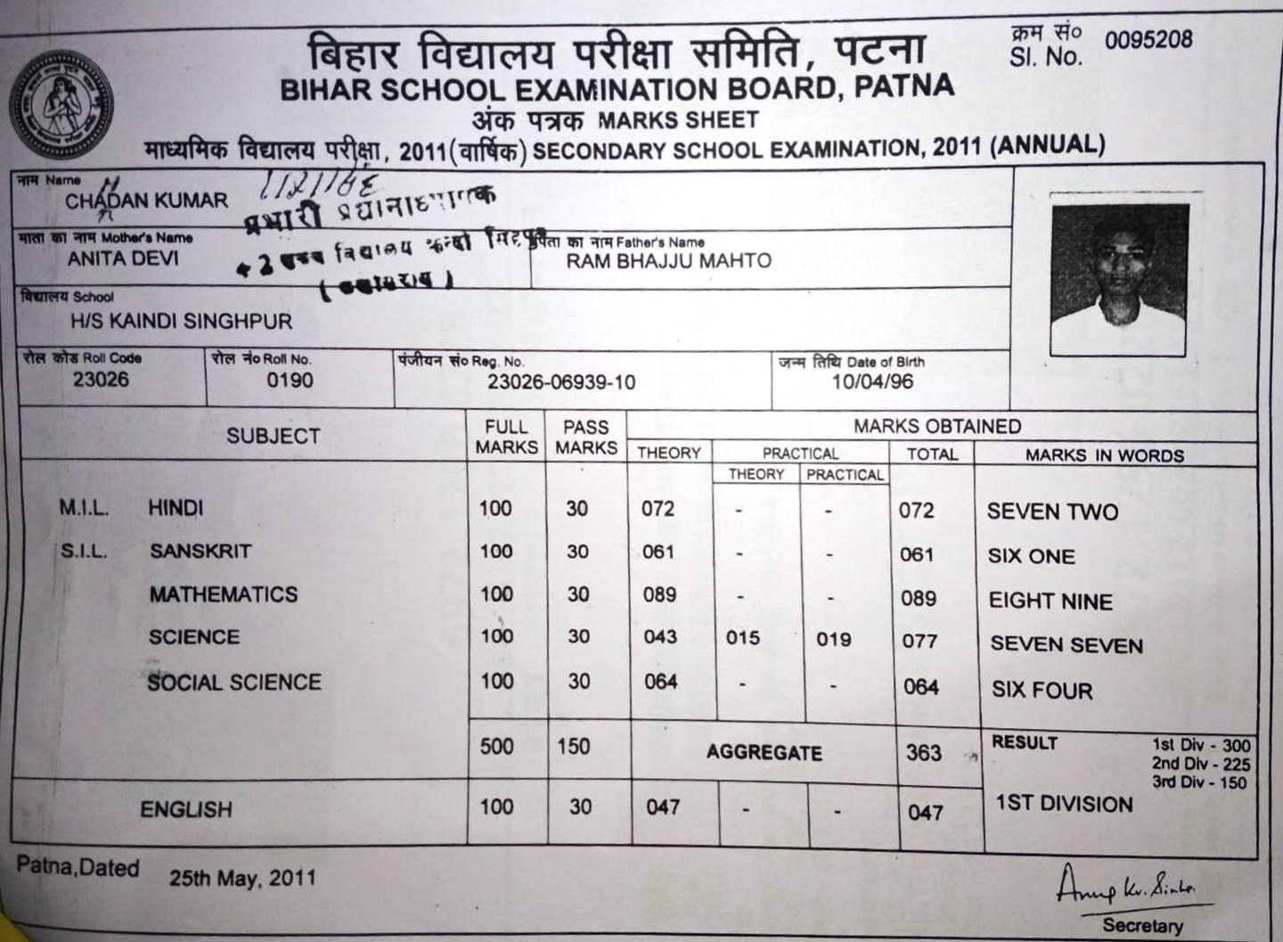 | Exam | Full Marks | Pass Marks | Marks Obtained |
