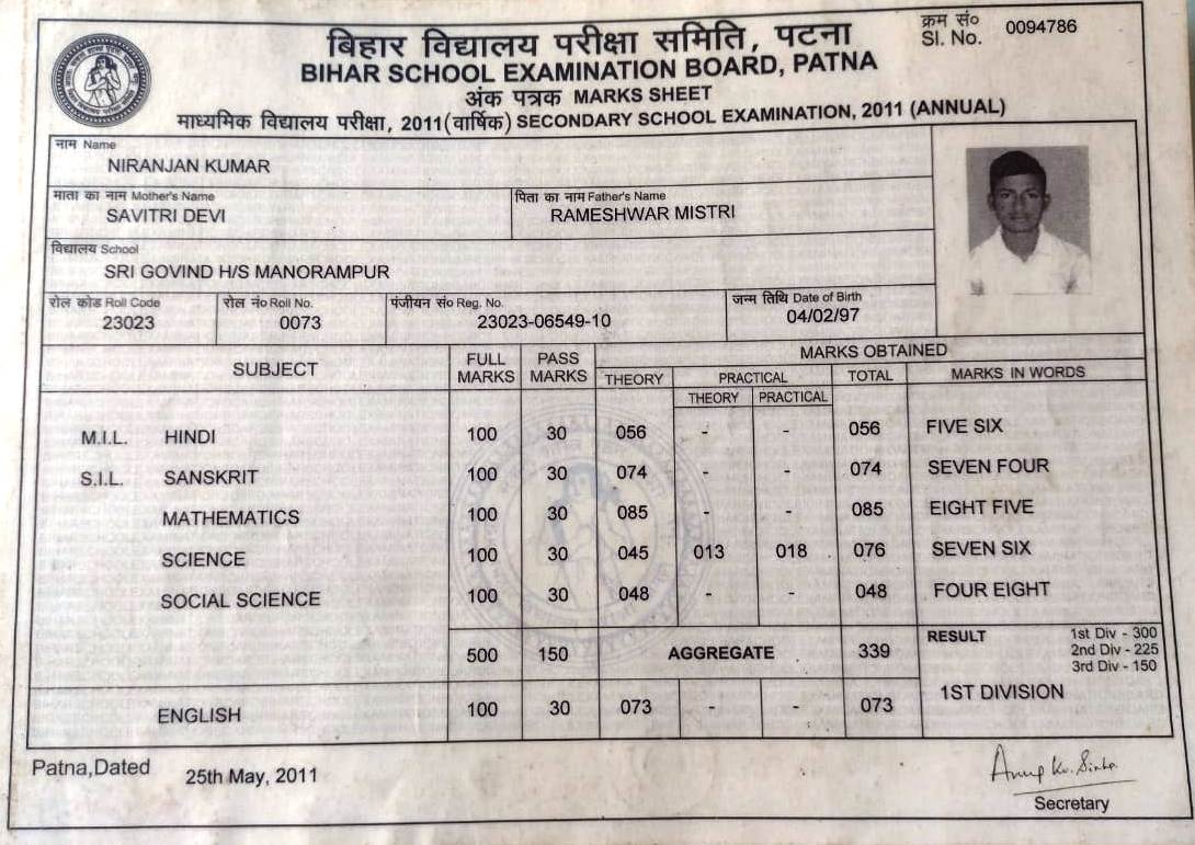 | Exam | Full Marks | Pass Marks | Marks Obtained |