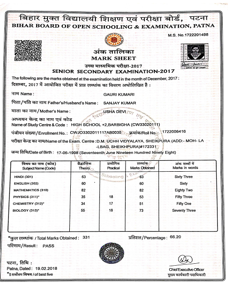 | Exam | Full Marks | Pass Marks | Marks Obtained |