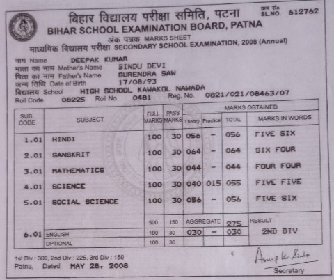 | Exam | Full Marks | Pass Marks | Marks Obtained |