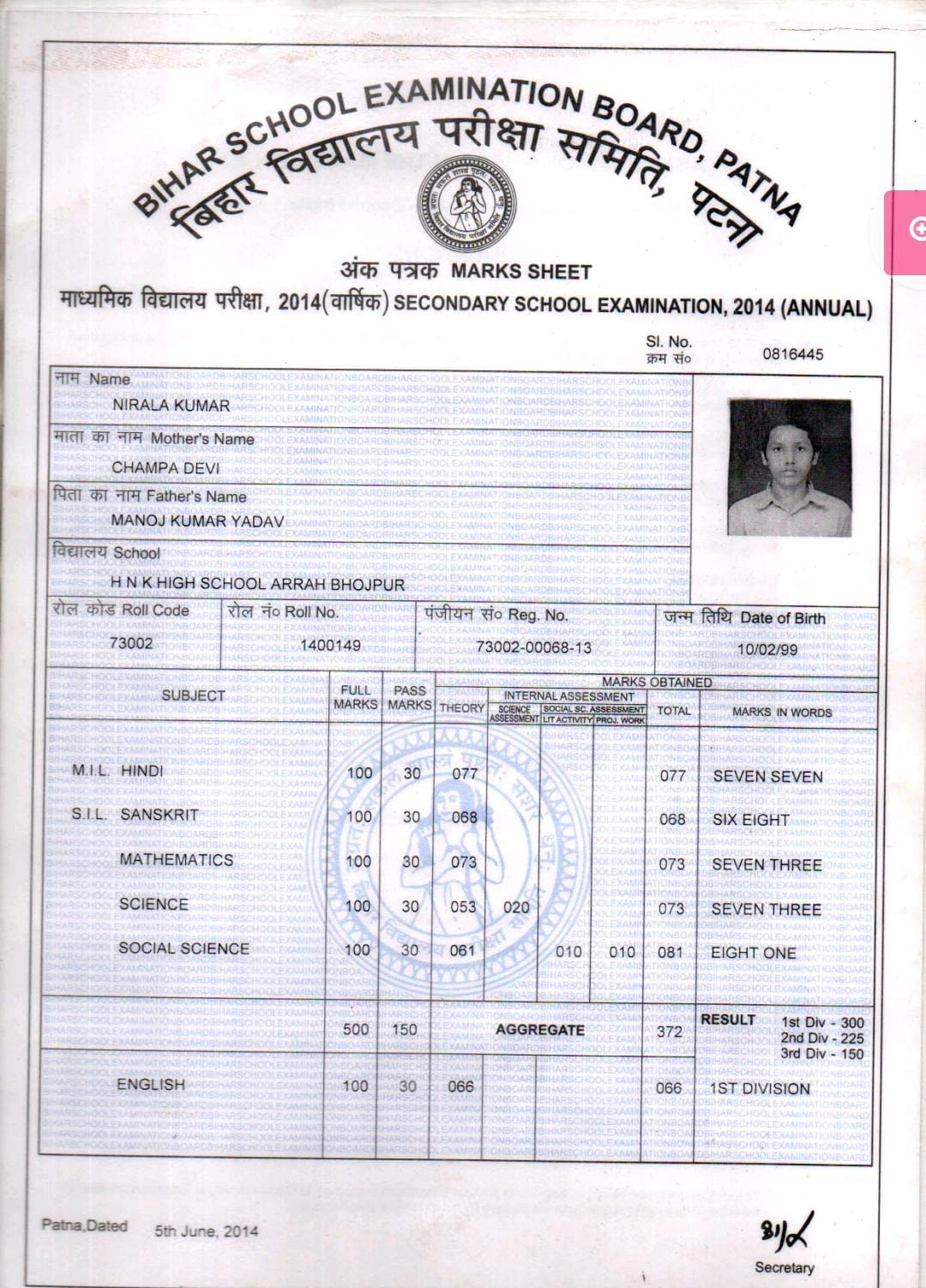| Exam | Full Marks | Pass Marks | Marks Obtained |