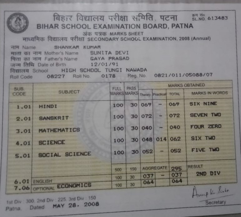 | Exam | Full Marks | Pass Marks | Marks Obtained |