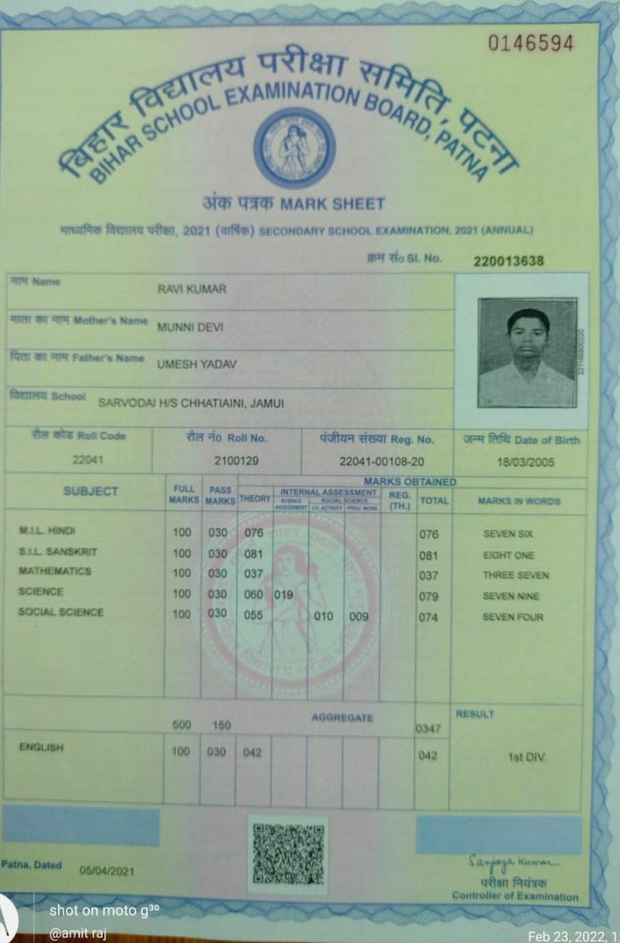 | Exam | Full Marks | Pass Marks | Marks Obtained |
