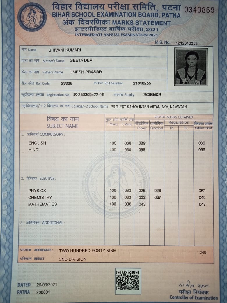 | Exam | Full Marks | Pass Marks | Marks Obtained |