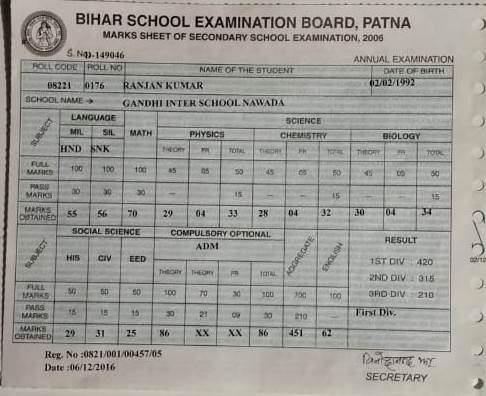 | Exam | Full Marks | Pass Marks | Marks Obtained |
