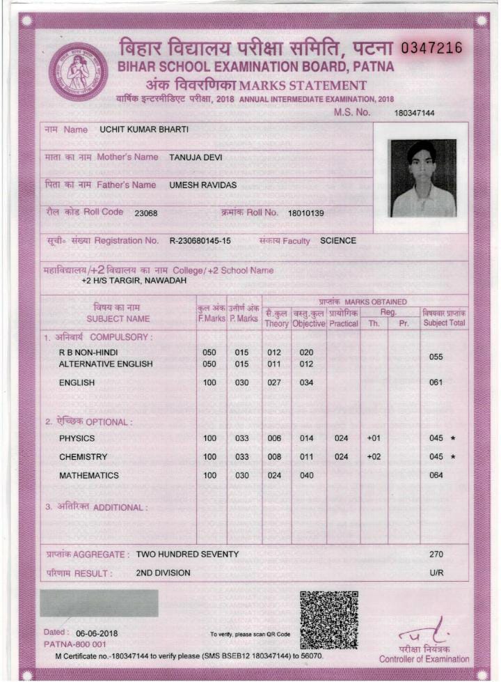 | Exam | Full Marks | Pass Marks | Marks Obtained |