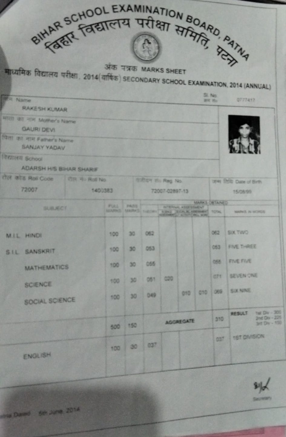| Exam | Full Marks | Pass Marks | Marks Obtained |