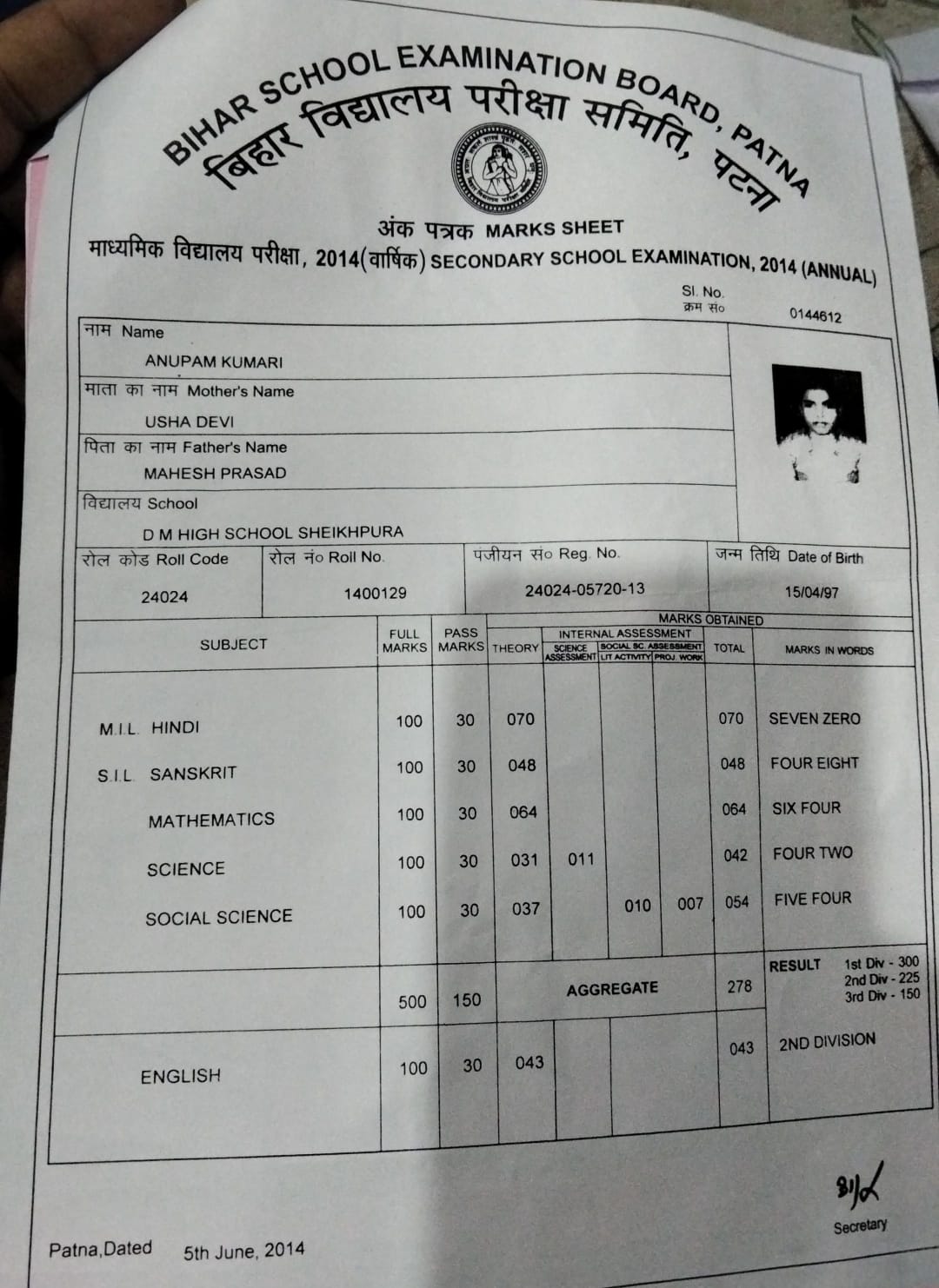 | Exam | Full Marks | Pass Marks | Marks Obtained |