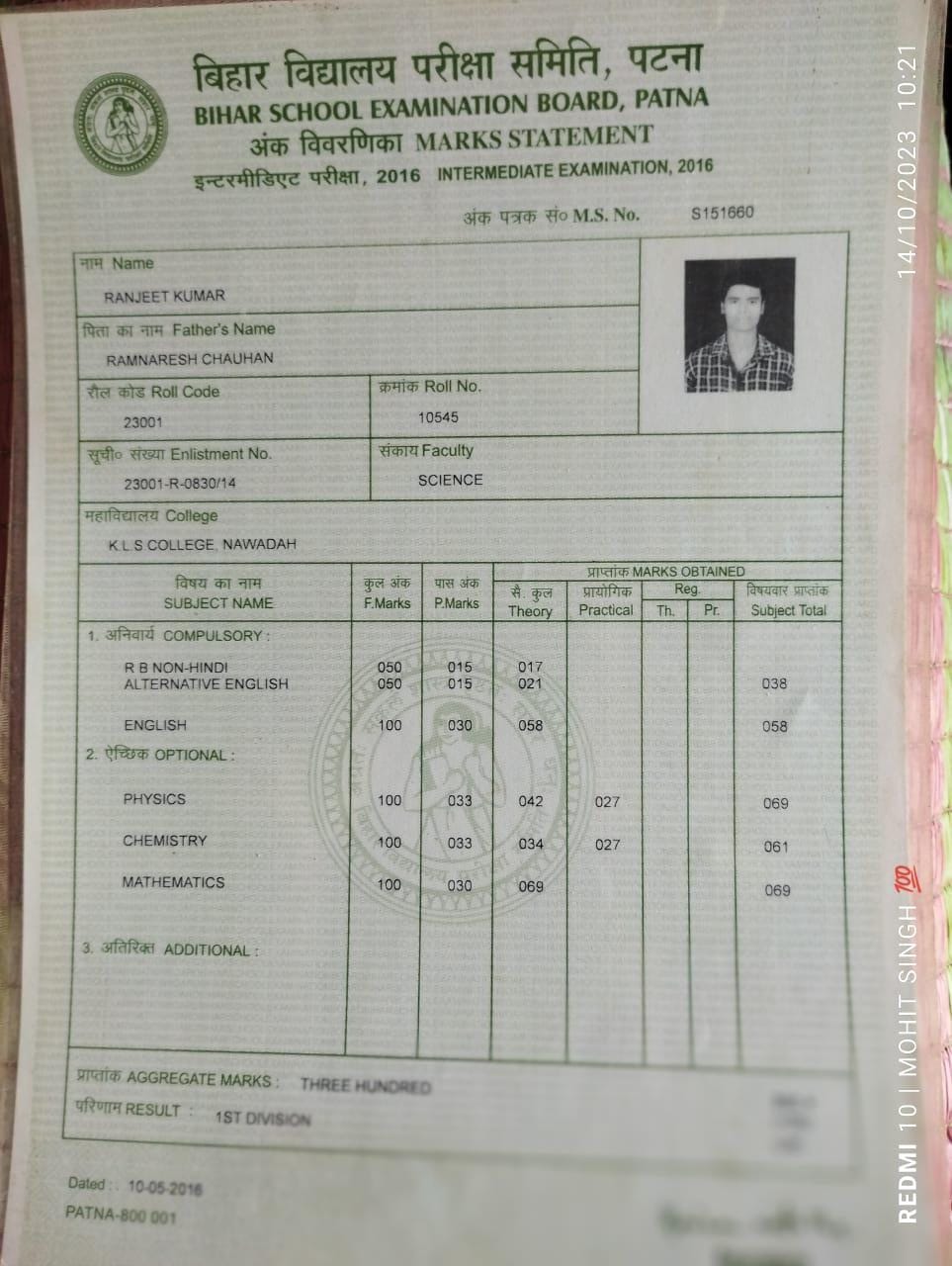 | Exam | Full Marks | Pass Marks | Marks Obtained |