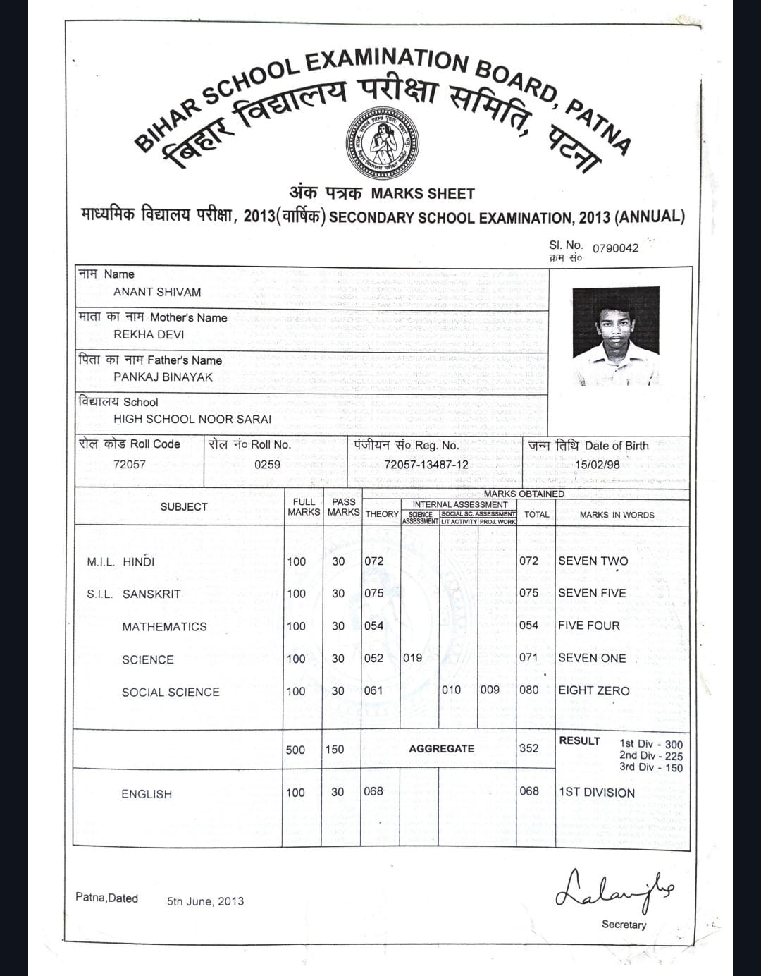 | Exam | Full Marks | Pass Marks | Marks Obtained |