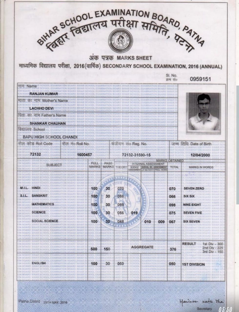 | Exam | Full Marks | Pass Marks | Marks Obtained |