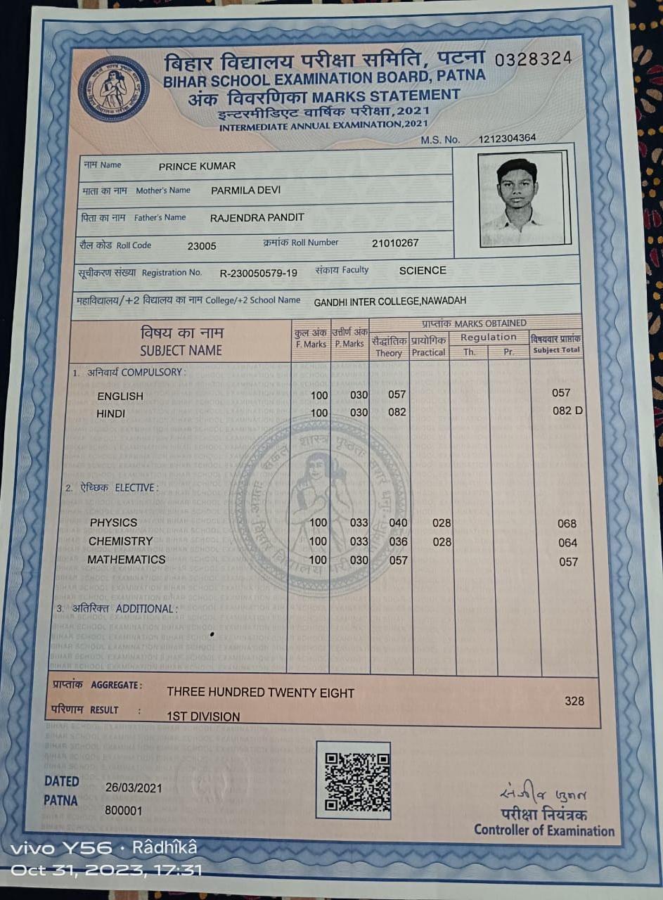 | Exam | Full Marks | Pass Marks | Marks Obtained |