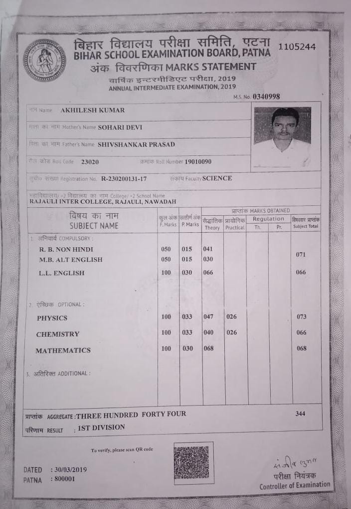 | Exam | Full Marks | Pass Marks | Marks Obtained |
