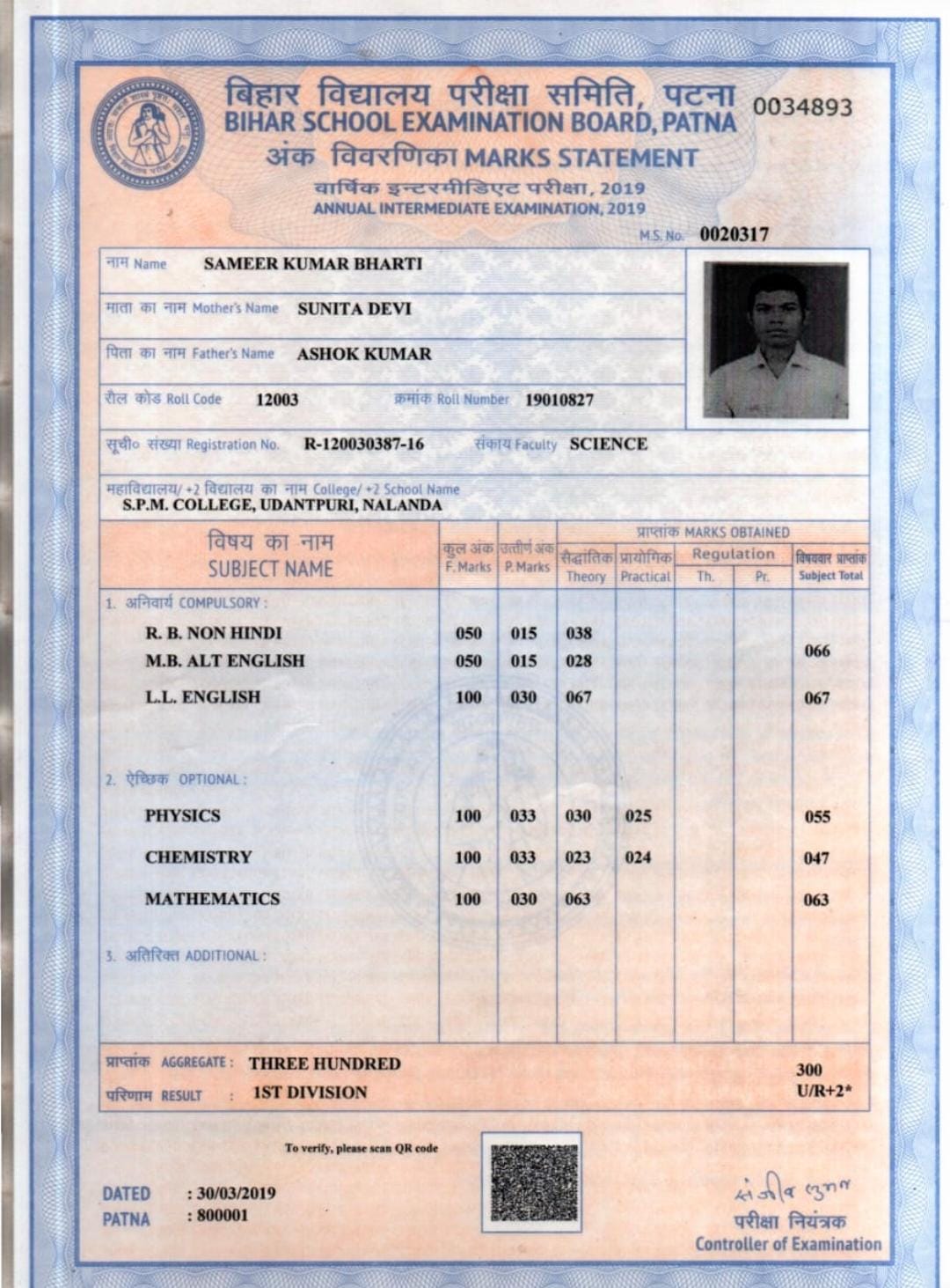 | Exam | Full Marks | Pass Marks | Marks Obtained |