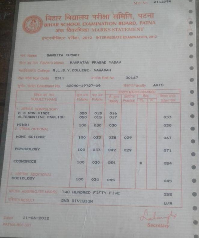 | Exam | Full Marks | Pass Marks | Marks Obtained |