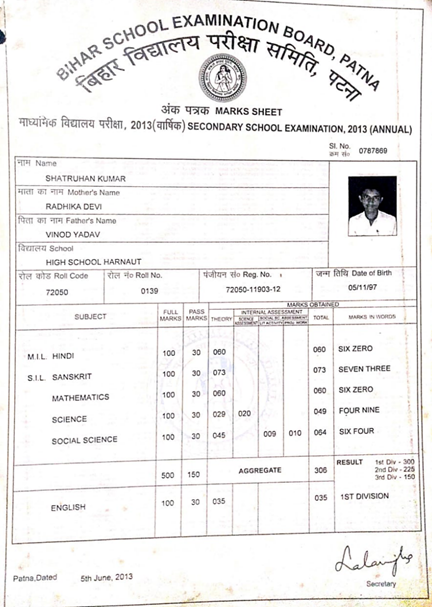 | Exam | Full Marks | Pass Marks | Marks Obtained |