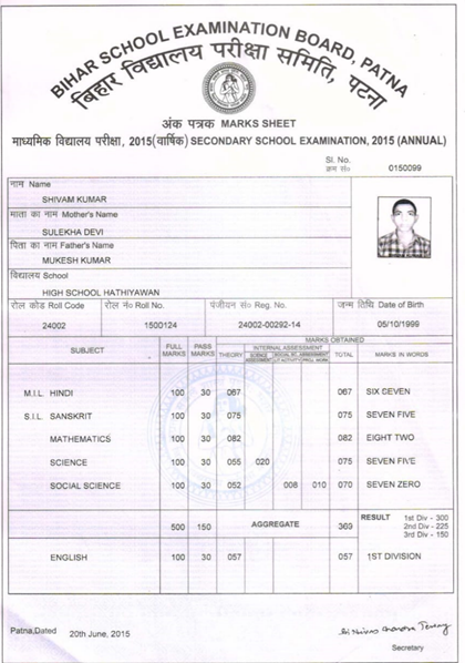 | Exam | Full Marks | Pass Marks | Marks Obtained |