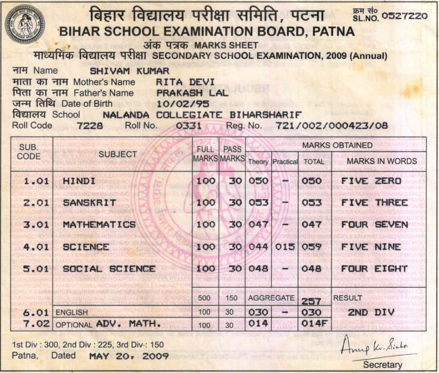 | Exam | Full Marks | Pass Marks | Marks Obtained |