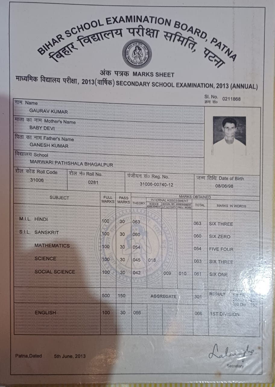 | Exam | Full Marks | Pass Marks | Marks Obtained |