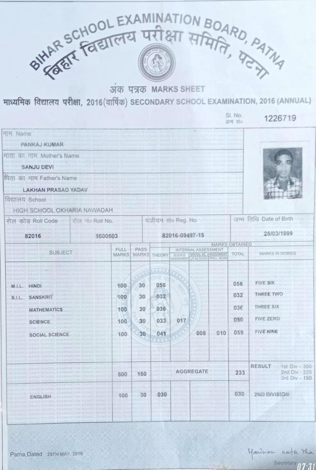 | Exam | Full Marks | Pass Marks | Marks Obtained |