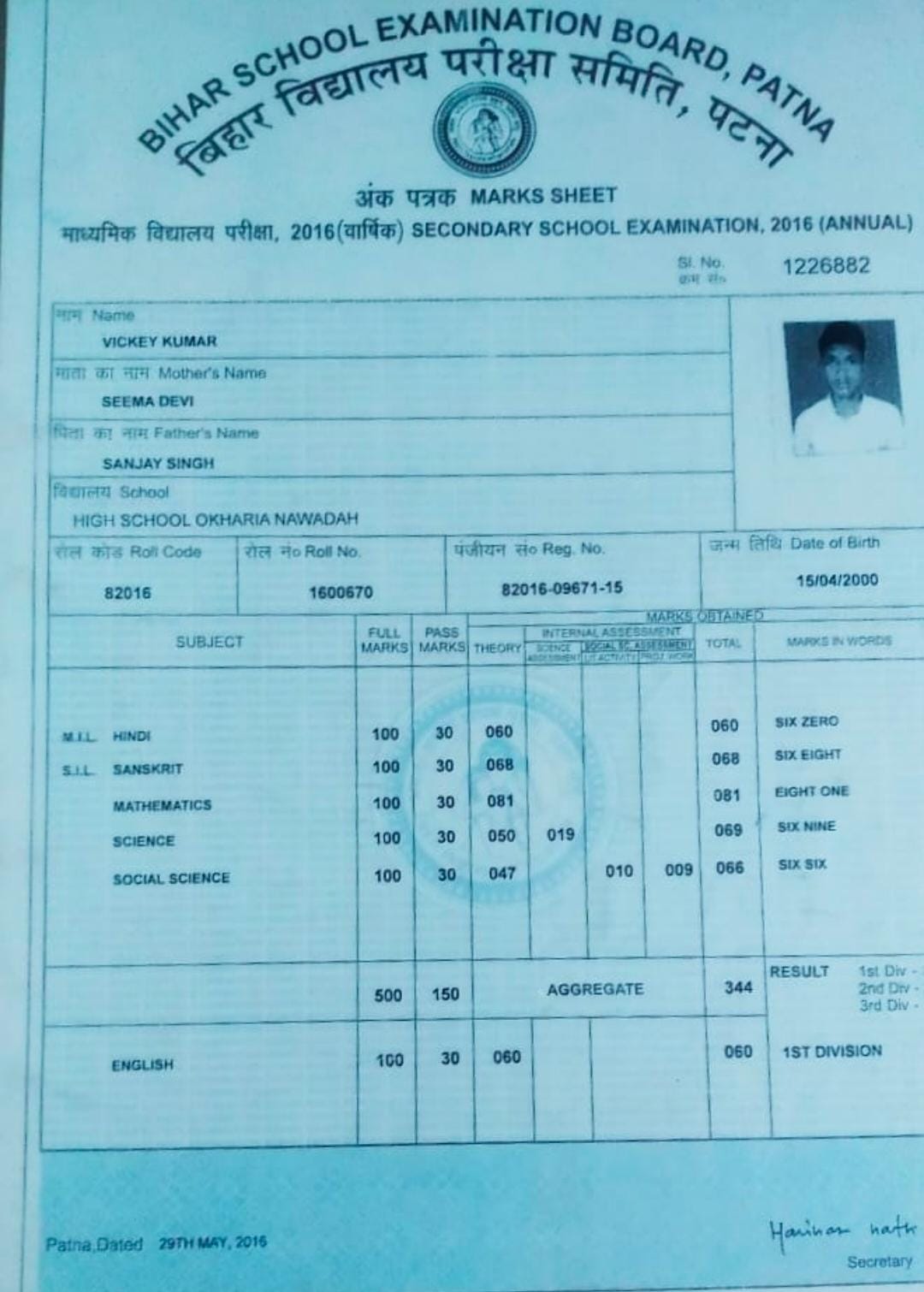 | Exam | Full Marks | Pass Marks | Marks Obtained |