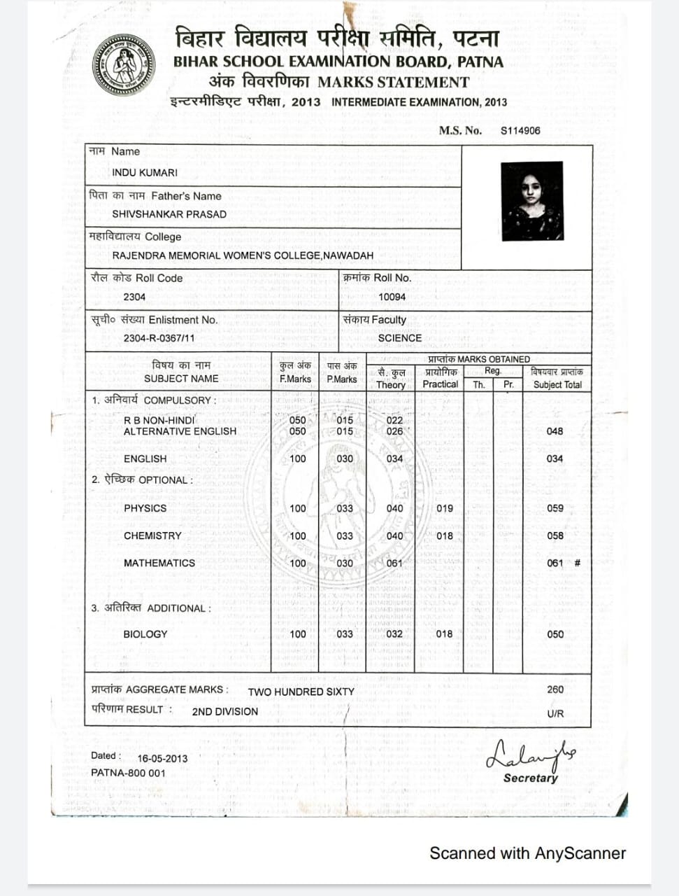 | Exam | Full Marks | Pass Marks | Marks Obtained |