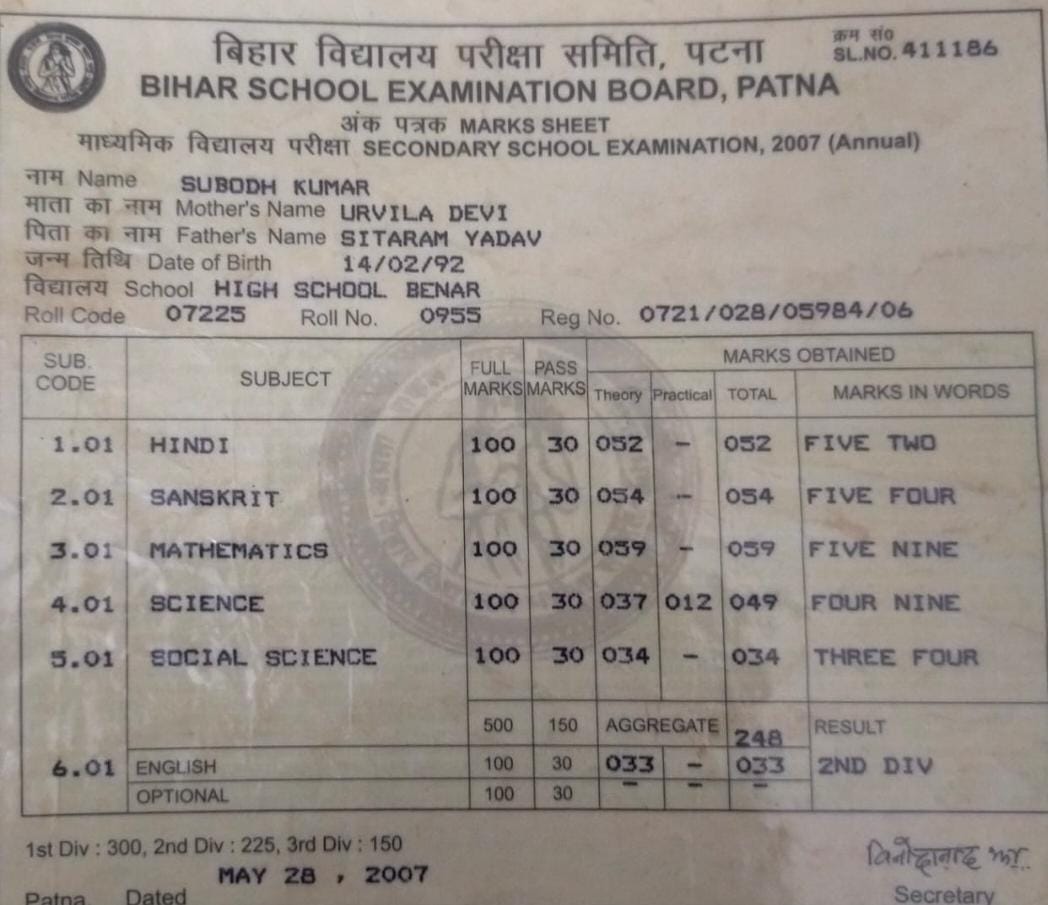 | Exam | Full Marks | Pass Marks | Marks Obtained |