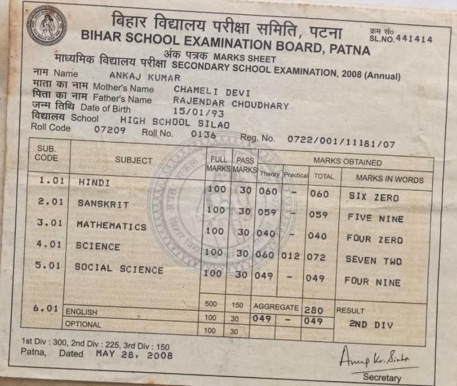 | Exam | Full Marks | Pass Marks | Marks Obtained |