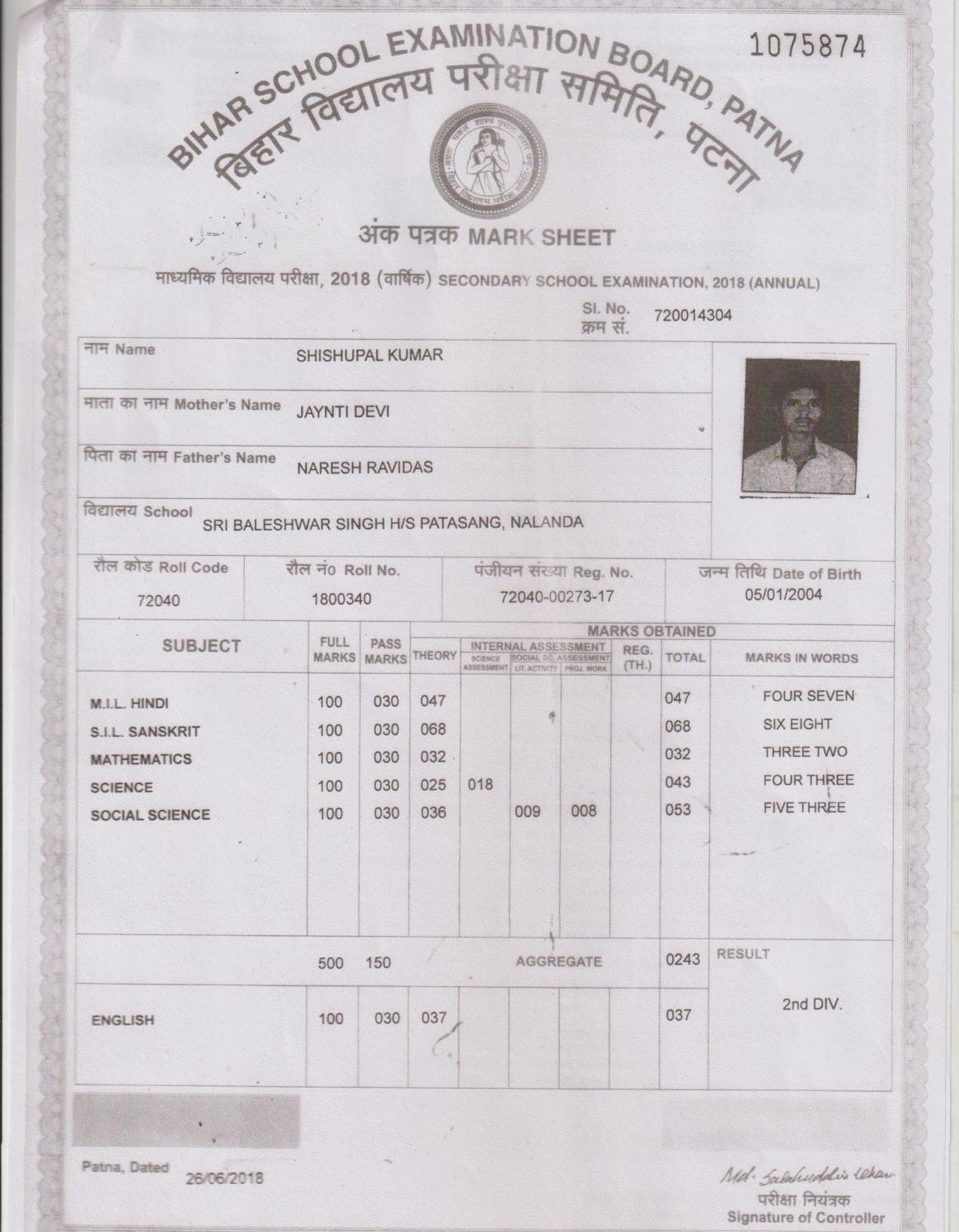 | Exam | Full Marks | Pass Marks | Marks Obtained |