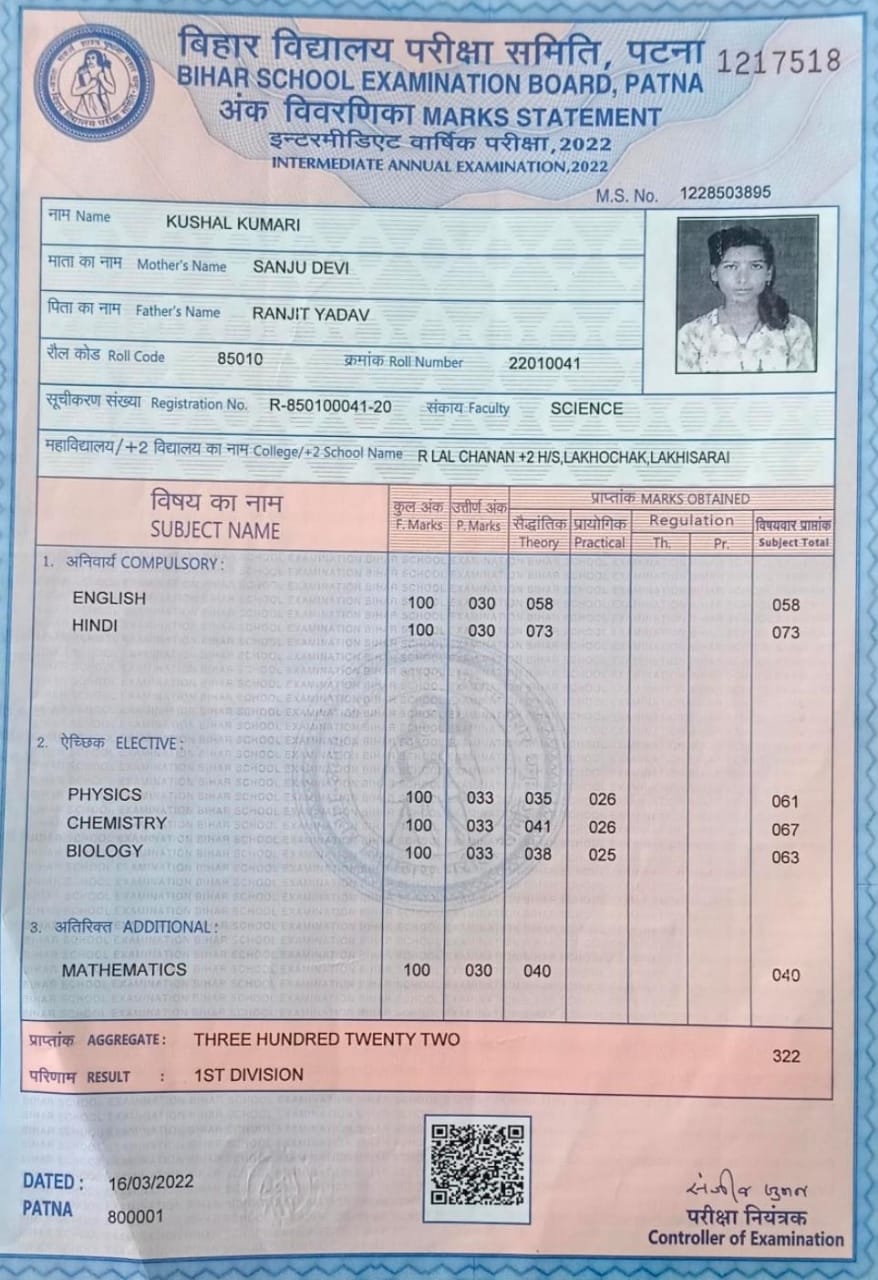 | Exam | Full Marks | Pass Marks | Marks Obtained |
