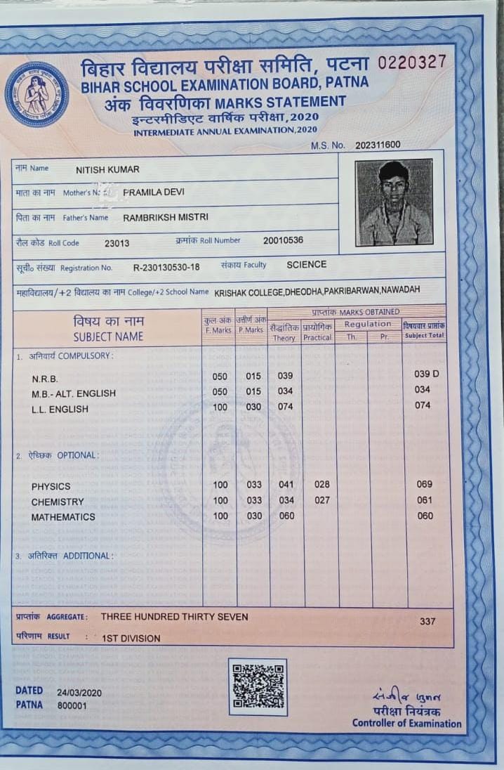 | Exam | Full Marks | Pass Marks | Marks Obtained |
