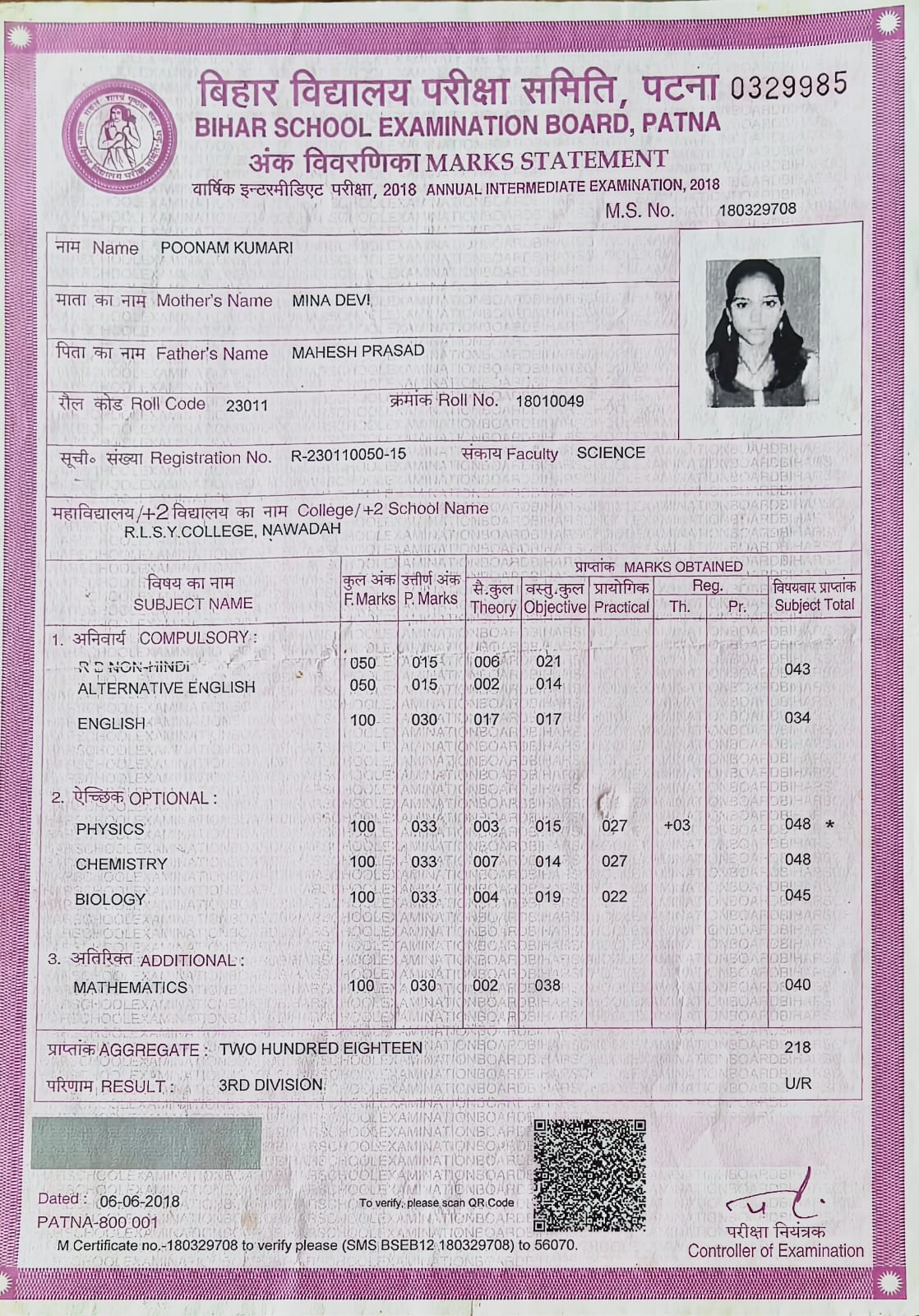| Exam | Full Marks | Pass Marks | Marks Obtained |