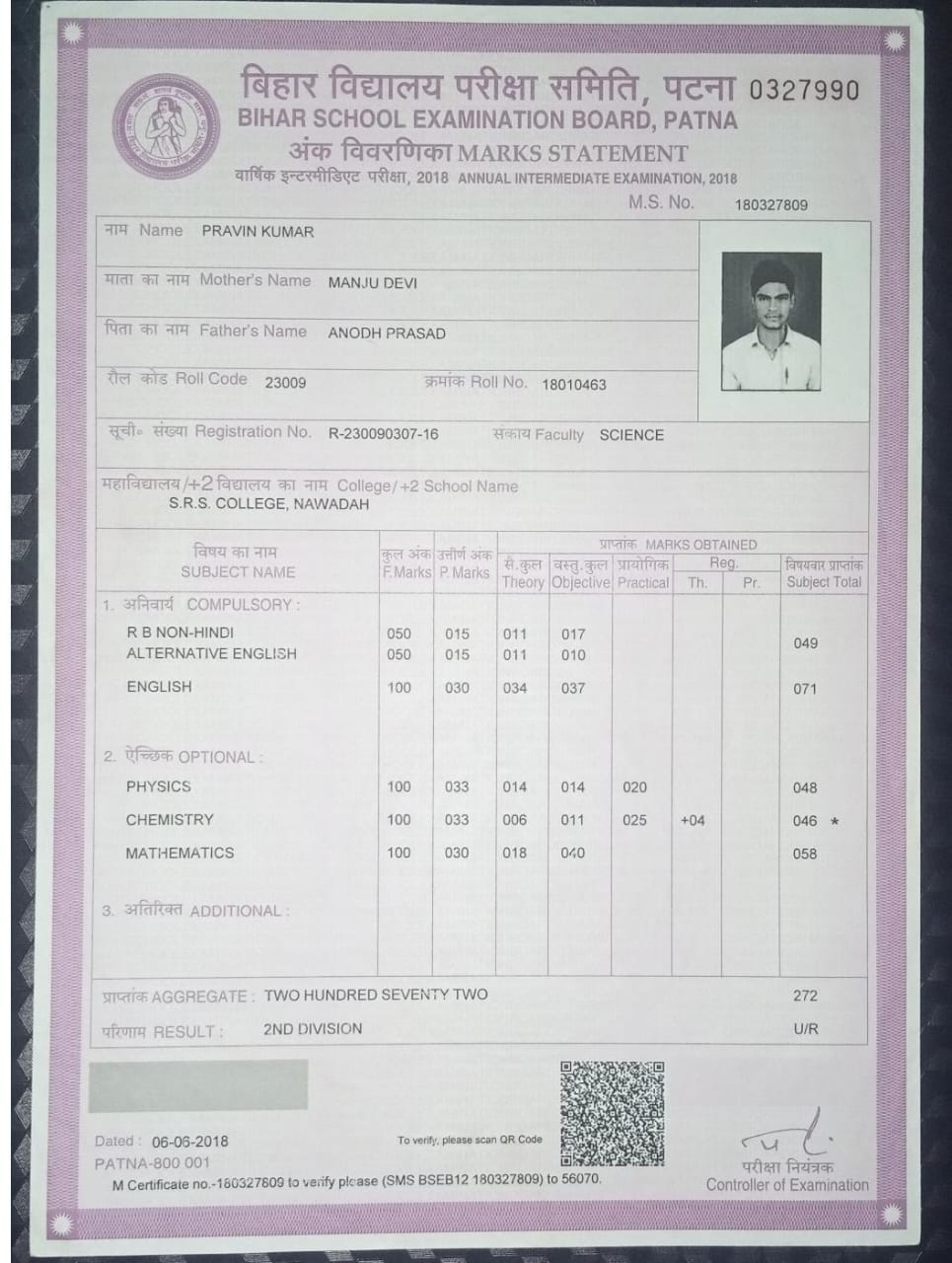 | Exam | Full Marks | Pass Marks | Marks Obtained |