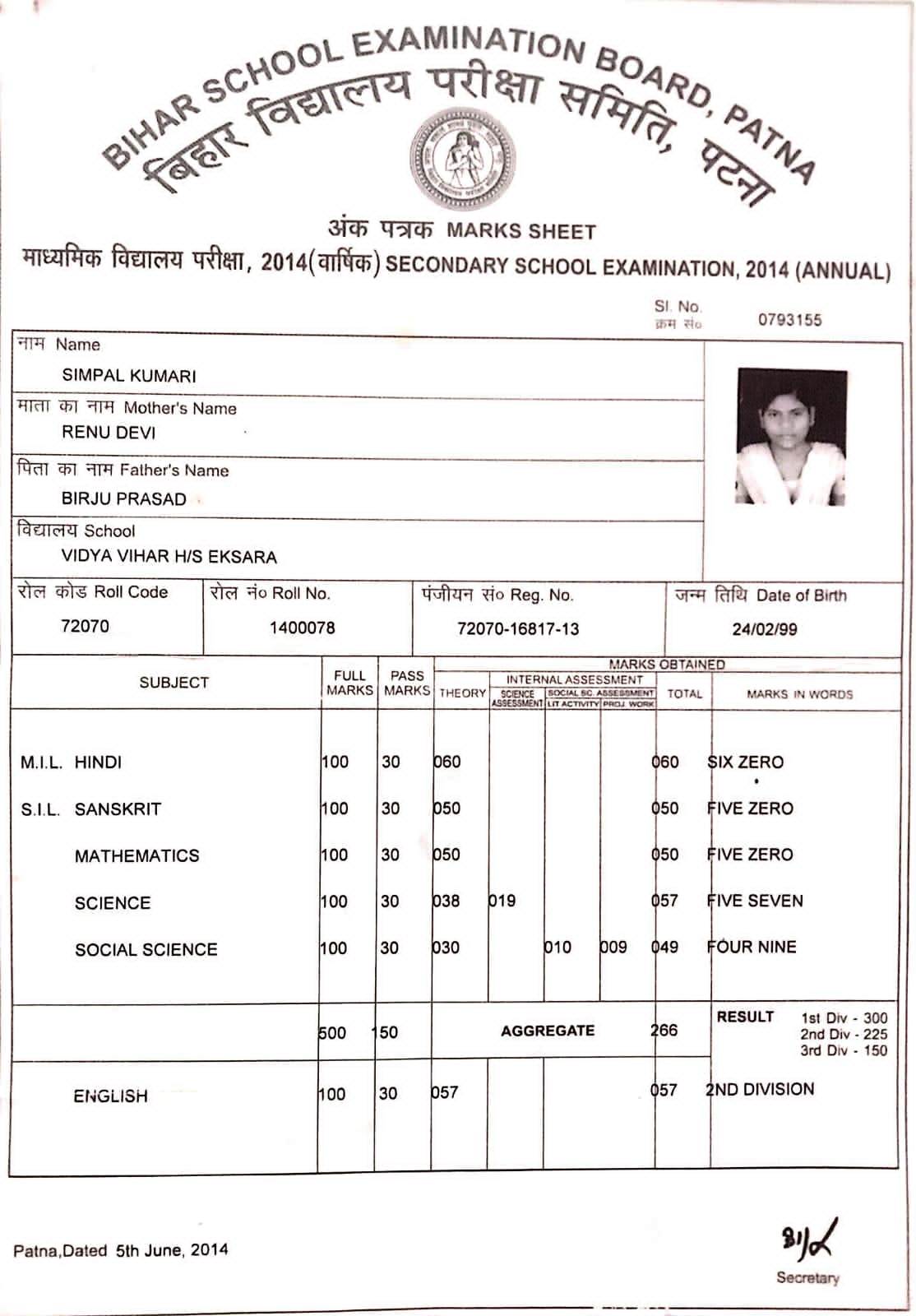 | Exam | Full Marks | Pass Marks | Marks Obtained |