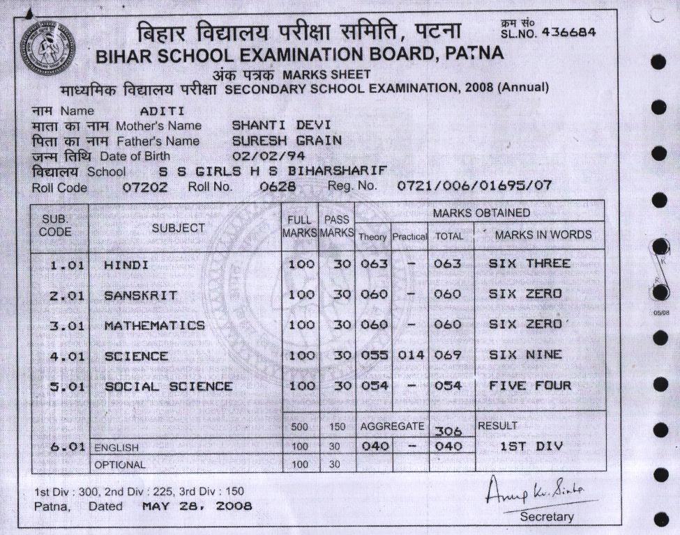 | Exam | Full Marks | Pass Marks | Marks Obtained |