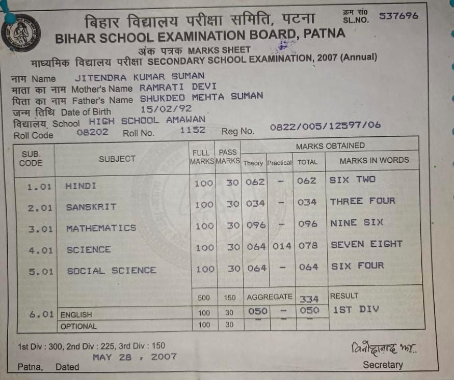 | Exam | Full Marks | Pass Marks | Marks Obtained |