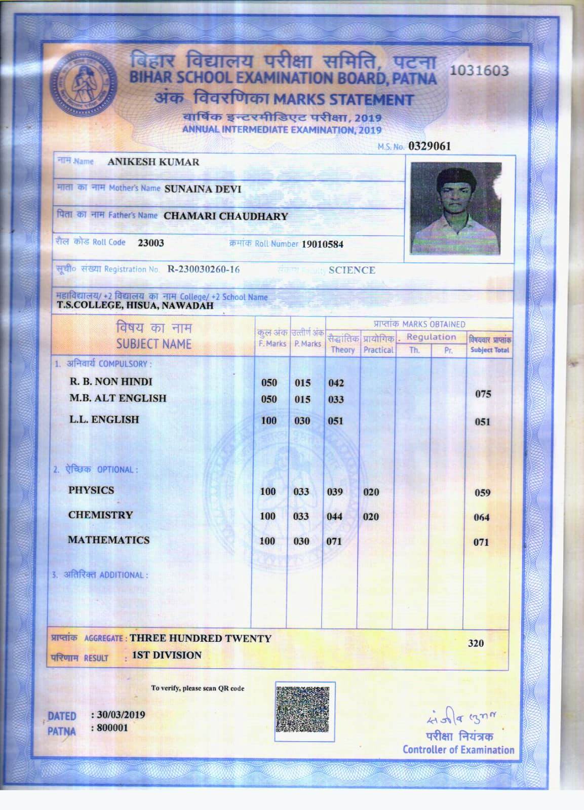 | Exam | Full Marks | Pass Marks | Marks Obtained |