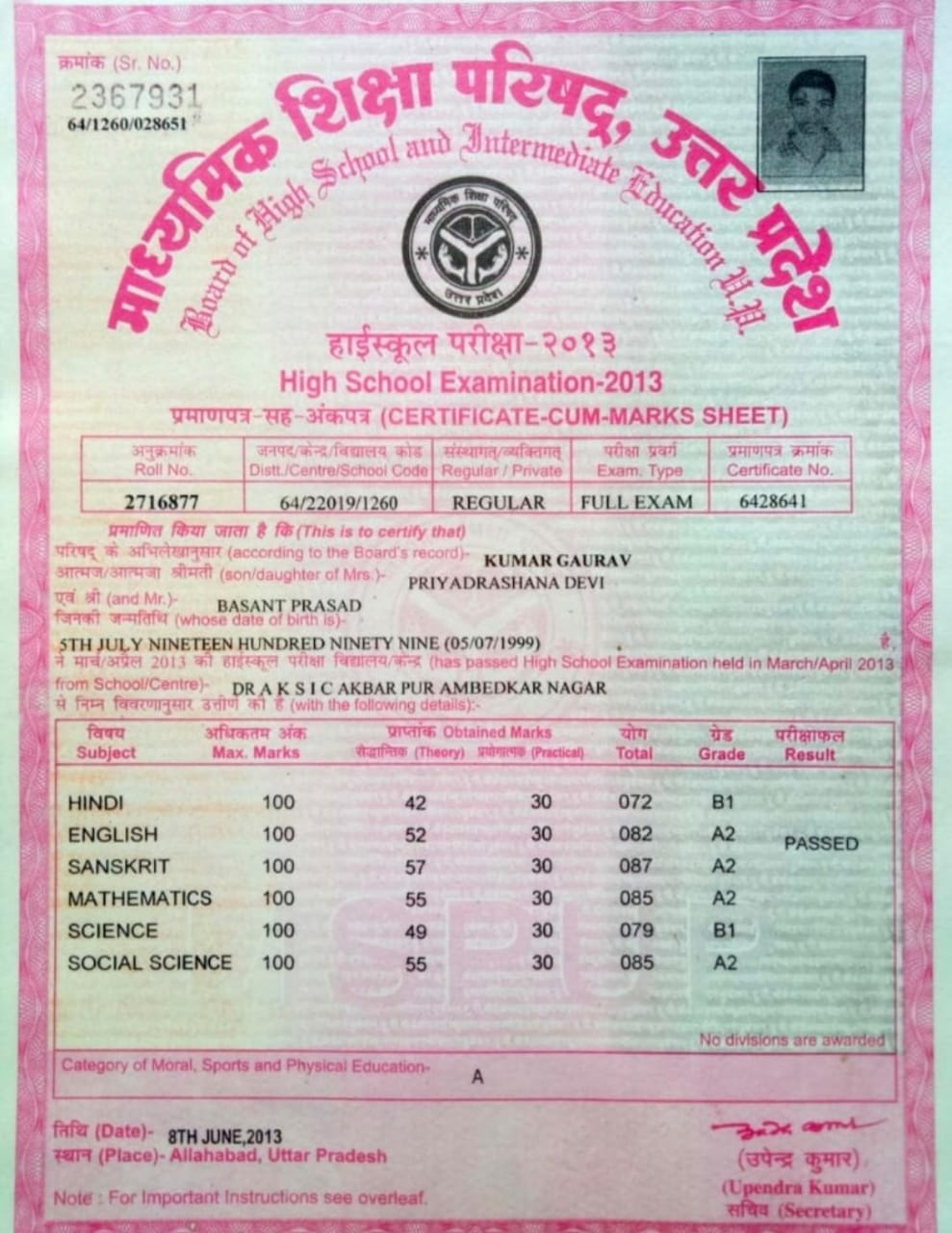 | Exam | Full Marks | Pass Marks | Marks Obtained |