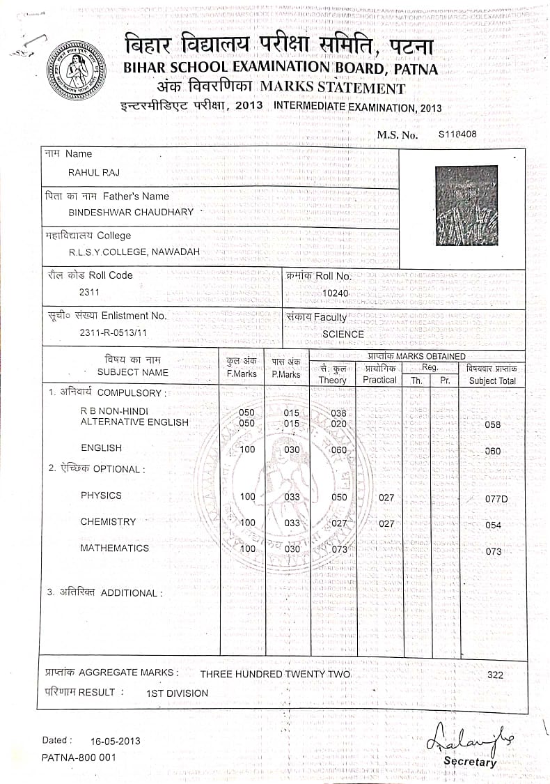 | Exam | Full Marks | Pass Marks | Marks Obtained |