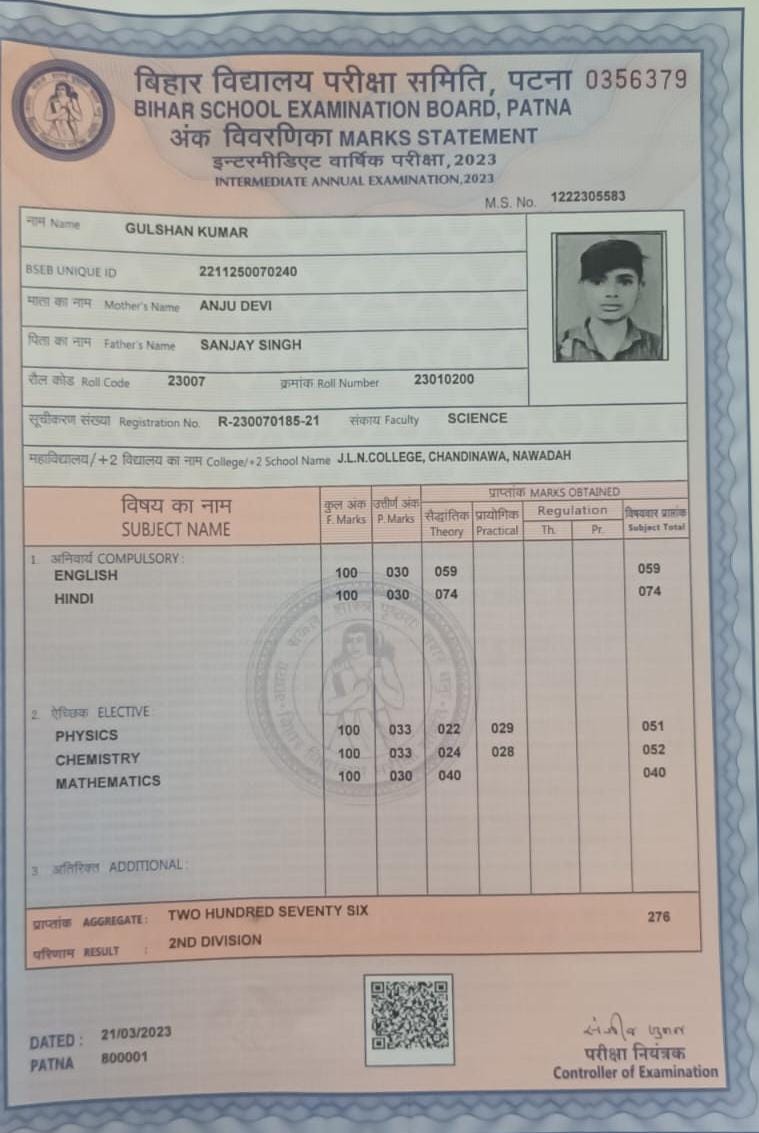| Exam | Full Marks | Pass Marks | Marks Obtained |