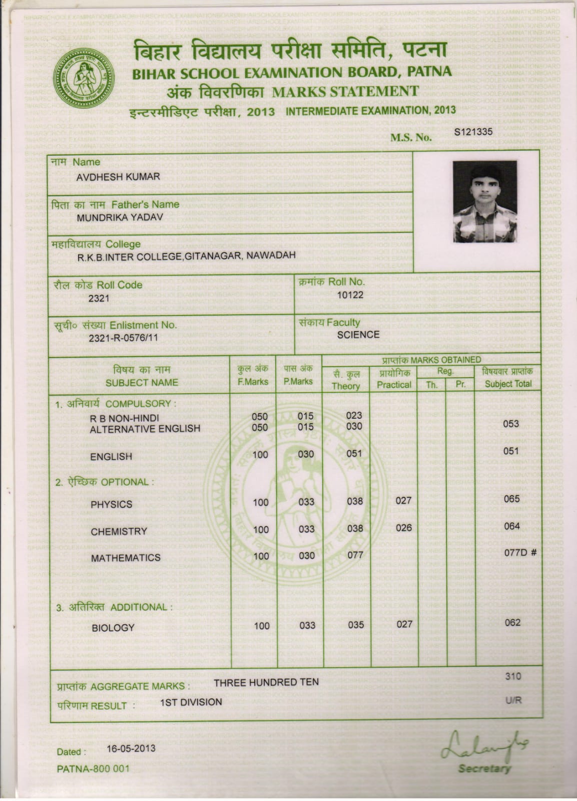 | Exam | Full Marks | Pass Marks | Marks Obtained |