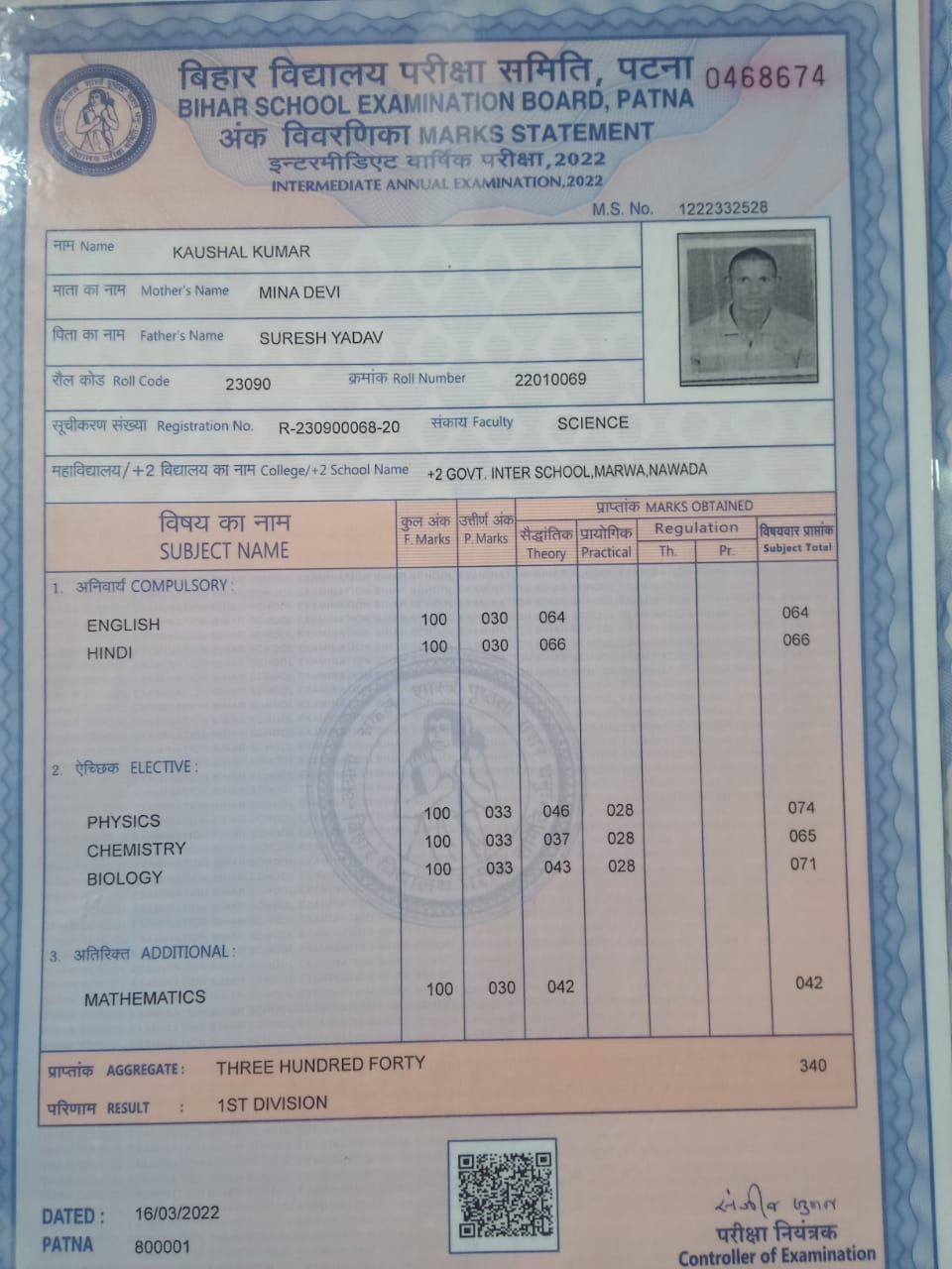 | Exam | Full Marks | Pass Marks | Marks Obtained |