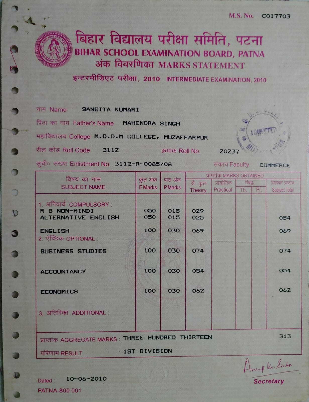 | Exam | Full Marks | Pass Marks | Marks Obtained |